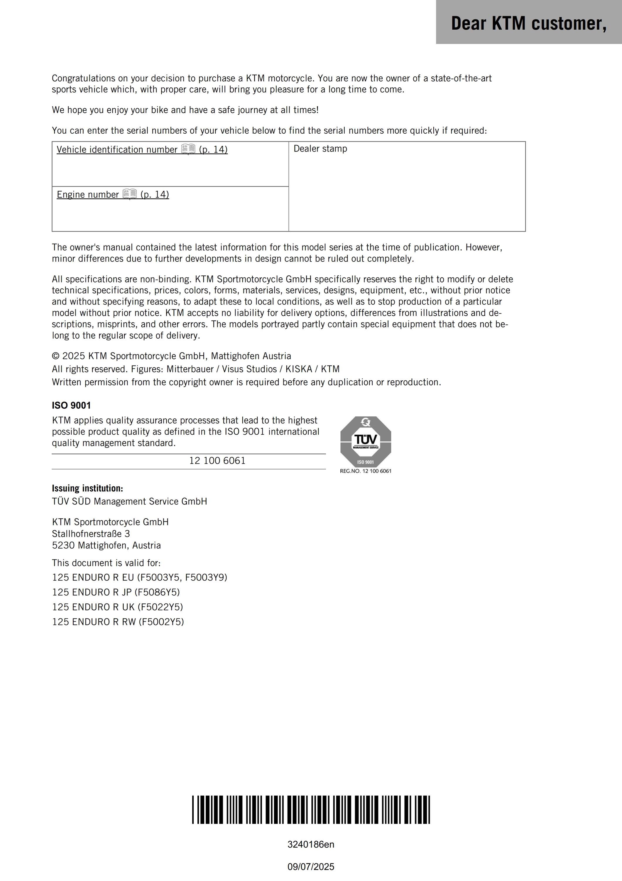 PLEASE CHOOSE WHICH LANGUAGE YOU REQUIREPRINTED & COMB BOUNDPRINTED ONTO 80GSM PAPER WITH 250GSM FRONT AND BACK CARD2025125 ENDURO RUSER MANUALUSER GUIDEOPERATING INSTRUCTIONS