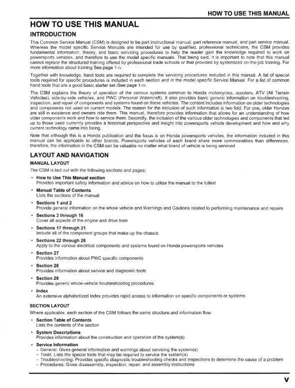 THIS MANUAL EXPLAINS THE THEORY OF OPERATION OF THE VARIOUS SYSTEMS COMMON TO HONDA MOTORCYCLES & MOTOR SCOOTERS & ATV'S. IT ALSO PROVIDES BASIC INFORMATION ON TROUBLESHOOTING, INSPECTION & REPAIR OF COMPONENTS & SYSTEMS FOUND ON THESE MACHINES.